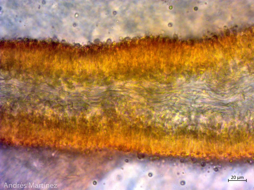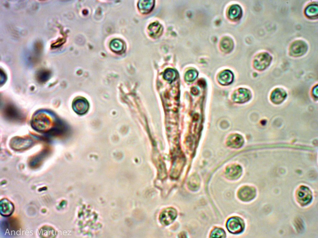 Basidiosporas anchamente elipsoidales a subglobosas, 4.7 - 5.8 x 3.8 - 4.7 µm (Q=1.2), hialinas en agua y KOH, de pared lisa y simple, apiculadas; inamiloides. Trama himenoforal irregular; basidios tetraspóricos, esbeltos o delgados y alargados, 23 - 32 x 5 - 10 µm, hialinos y algunos con contenidos internos; pleurocistidios no observados; queilocistidios cilíndricos, claviformes, 20 - 41 x 5 - 8 µm, hialinos, de pared delgada y sin contenidos internos. Hifas de la pileipellis septadas y sin fibulas.