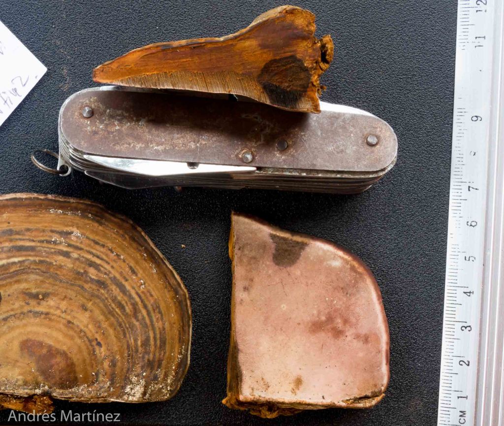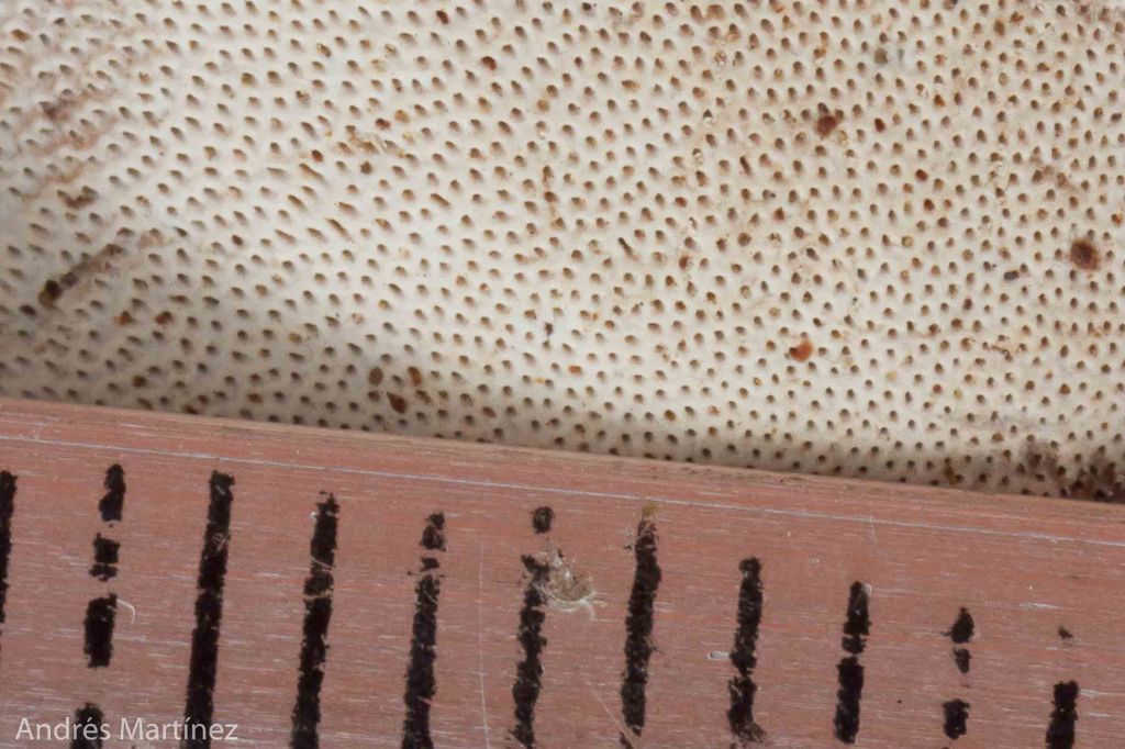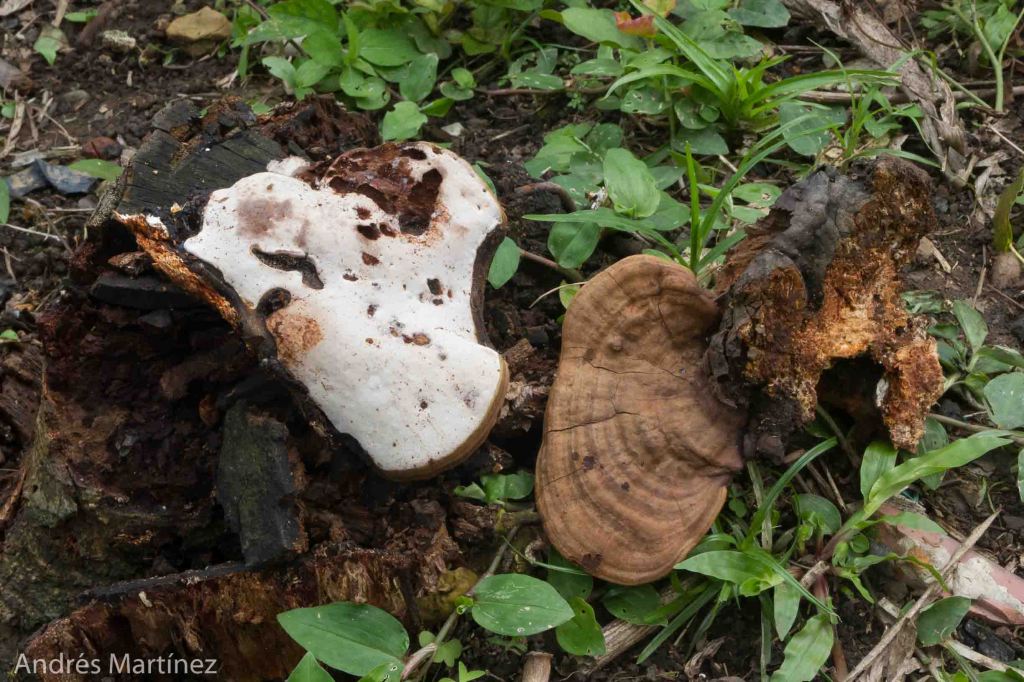 Descripción: Basidiocarpo sésil, dimidiado y de consistencia leñosa; hasta 16x12x4cm. Superficie superior glabra, opaca, seca; color café compuesto de varias tonalidades claras y oscuras con zonaciones concéntricas; borde algo engrosado, color blanco crema, en ocasiones marrón-rojizo oscuro de hasta 4 mm de grosor. Superficie inferior porosa; seca, opaca; blanco crema; poros circulares de 6 a 8 poros/mm. Mutable al contacto tornándose café-rosáceo claro. Reacción KOH+ inmediata tornándose azul-grisáceo. Contexto hasta 2.5 cm; color pardo; textura leñosa; tubos no estratificados, color café-amarillo, hasta 8 mm de longitud; borde redondeado; entre el contexto y la superficie superior hay una delgada linea negra <1 mm que llega hasta el borde. Reacción KOH café muy oscuro a negro en todo el basidioma. Basidiosporas ganodermatoides, elipsoidales, 7.3 - 9 x 4.6 - 6.6 µm (Q=1.4), café amarillo pálido en agua y KOH, de doble pared y con pilares entre ambas paredes, apice aplanado a truncado, esporas inamiloides. Sistema hifal trimítico. Ecología: Solitario a disperso, fructificando sobre restos de troncos caídos. Común en bosques y zonas intervenidas rurales y urbanas.
