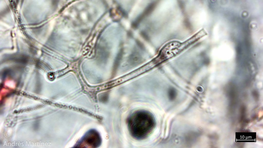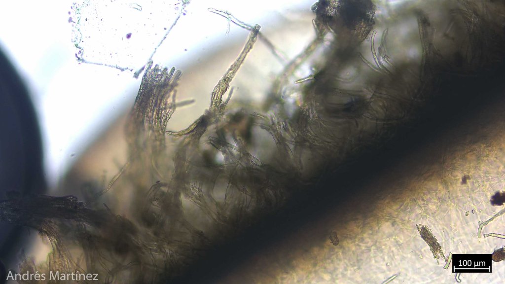 Pelos de la superficie superior 140 - 470 x 5.1 - 9 µm, de pared gruesa, hialinos. Hifas de contexto hialinas, septadas y con fíbulas, fuertemente ramificadas, de 1.5 - 3.9 µm de grosor; hifas de la médula levemente pigmentadas de amarillo-marrón claro. Médula presente, de ± 450 µm de grosor; zona pilosa de ± 350 µm; zona compacta de ± 160 µm; zona laxa superior de ± 435 µm; zona laxa inferior de ± 525 µm; contexto sin pelos de ± 2000 µm de ancho.