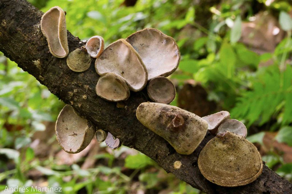 Descripción: Basidiocarpo en forma de disco o copa aplanada; consisatencia cartilaginosa; hasta 5x4x0.4 cm. Superficie interior seca, opaca, con presencia de pruina marrón-grisáceo sobre una superficie de aspecto higrófano y liso color marrón-vinotinto oscuro y brillante. Reacción KOH+ azul-grisáceo oscuro inmediata. Superficie exterior afelpada, < 1 mm de grosor; color café-grisáceo a verdoso-claro. Reacción KOH azul-grisáceo oscuro.