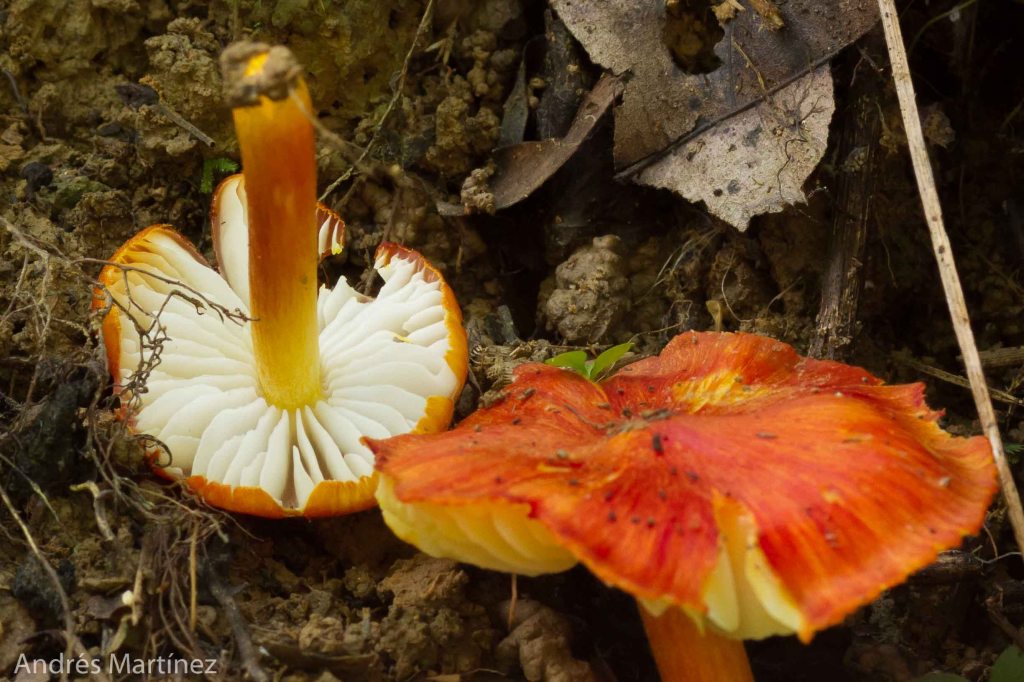 Descripción: Píleo plano convexo y levemente depreso de juvenil, plano y levemente papilado en la madurez; rojo vivo de juvenil a naranja-rojizo fuego en la madurez; hasta 5 cm de diámetro; superficie finamente fibrilosa a estriada, seca, opaca; borde dentado de juvenil, recto, incurvado o erodado en la madurez; cutícula difícilmente desprendible. Reacción KOH naranja-amarillo vivo.