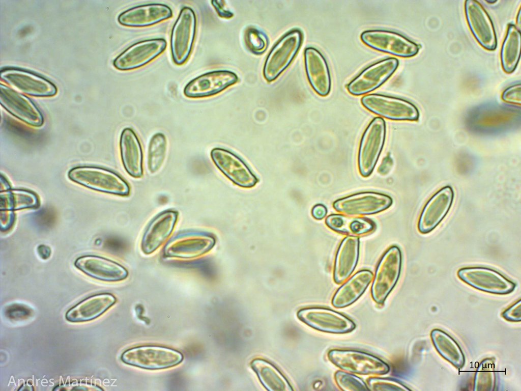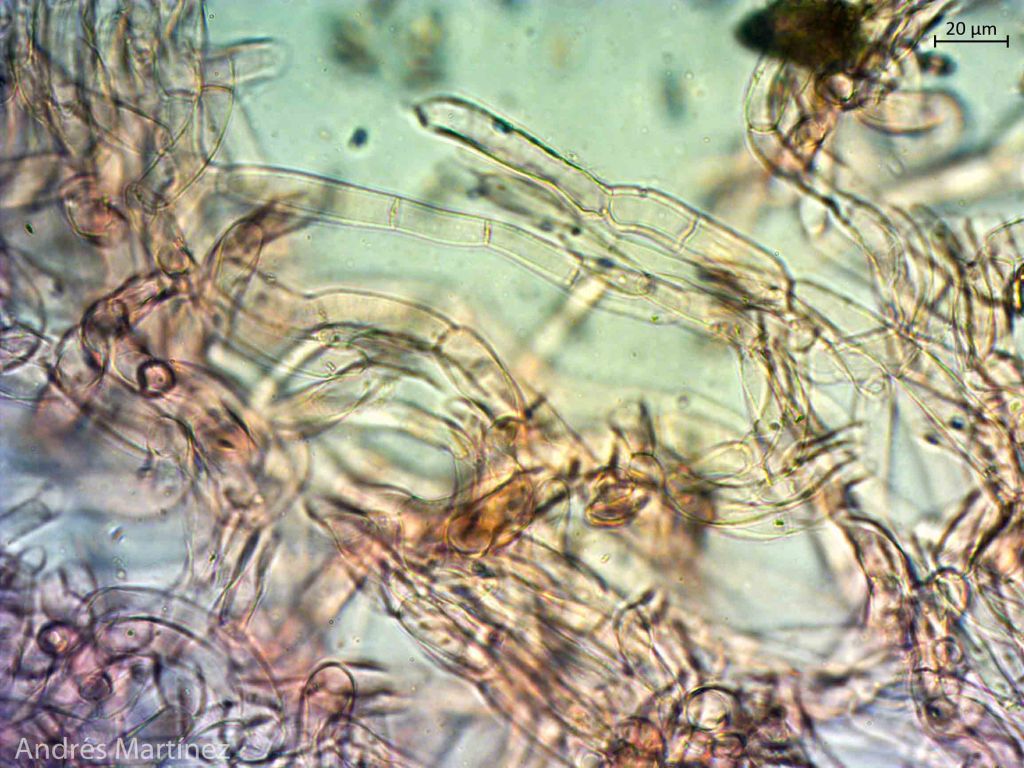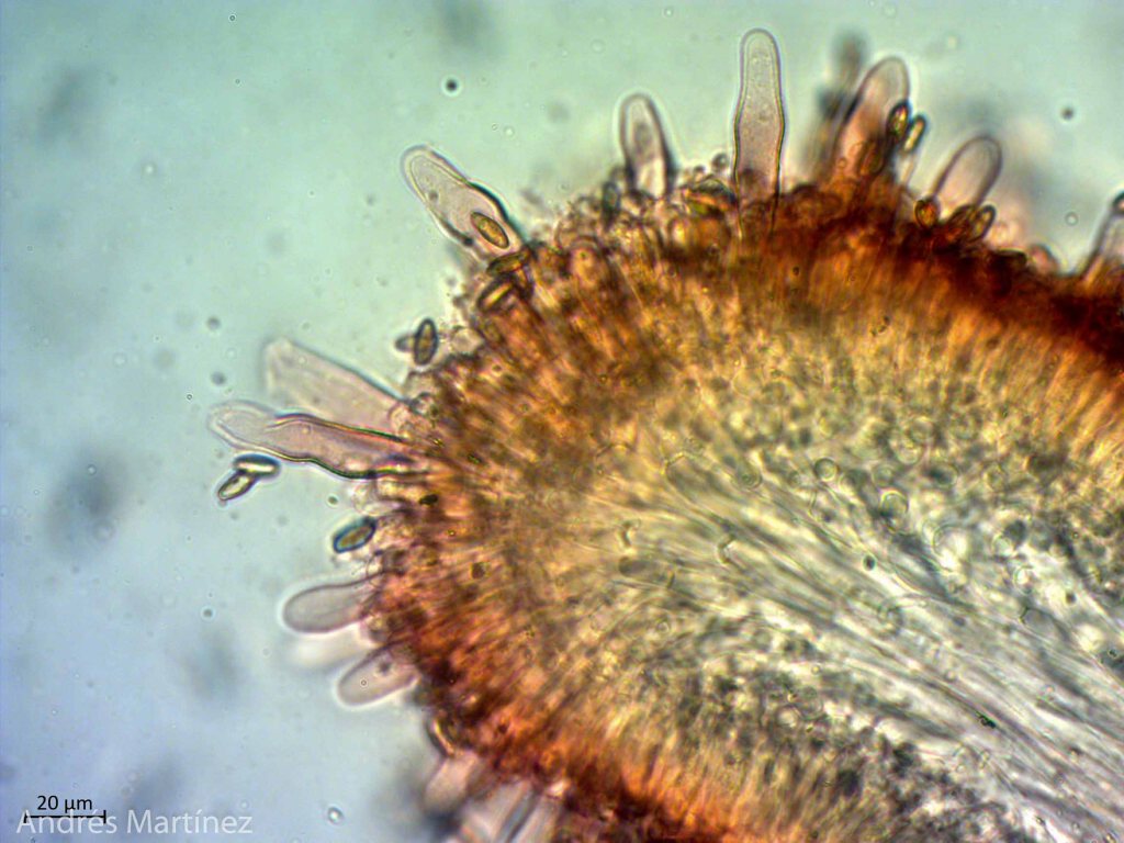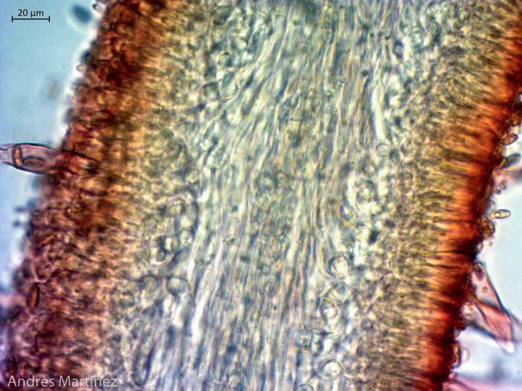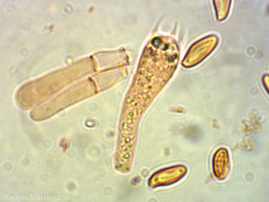 Basidiosporas subfusiformes a cilíndricas, 10 - 14 x 4.2 - 5.6 μm (Q=2.4), amarillo muy pálido en agua, y café-amarillo pálido en KOH; pared gruesa y con surcos longitudinales que no se aprecian muy bien; apiculadas; inamiloides; trama himenoforal divergente; basidios tetraspóricos, clavados, 41 - 48 x 11 - 13 μm, hialinos; pleurocistidios conspicuos y numerosos, cilíndricos a langeniformes, con la base más ancha, 48 - 91 x 12 - 17 μm, hialinos, de pared aparentemente gruesa, lisa y sin contenidos internos; queilocistidios muy similares en forma y estructura a los pleurocistidios, numerosos, 52 - 77 x 11 - 14 μm; pileipellis en tricodermo con hifas entrelazadas, hialinas, septadas y sin fibulas.