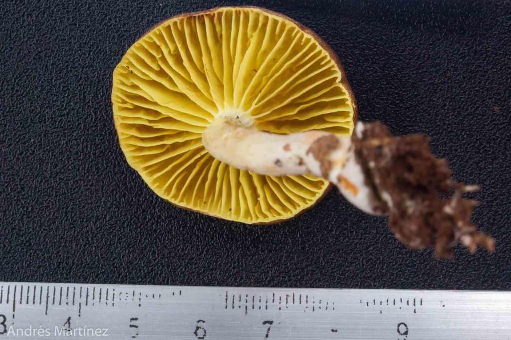 Himenóforo lamelado, subdistante a cercano; decurrente; amarillo verdoso; lamela arqueada y ancha de hasta 8 mm, aspecto higrófano; lisa y con borde liso; lamelulas de diferentes longitudes; himenio mutable al corte tornándose levemente azul-verdoso. Reacción KOH naranja vivo.