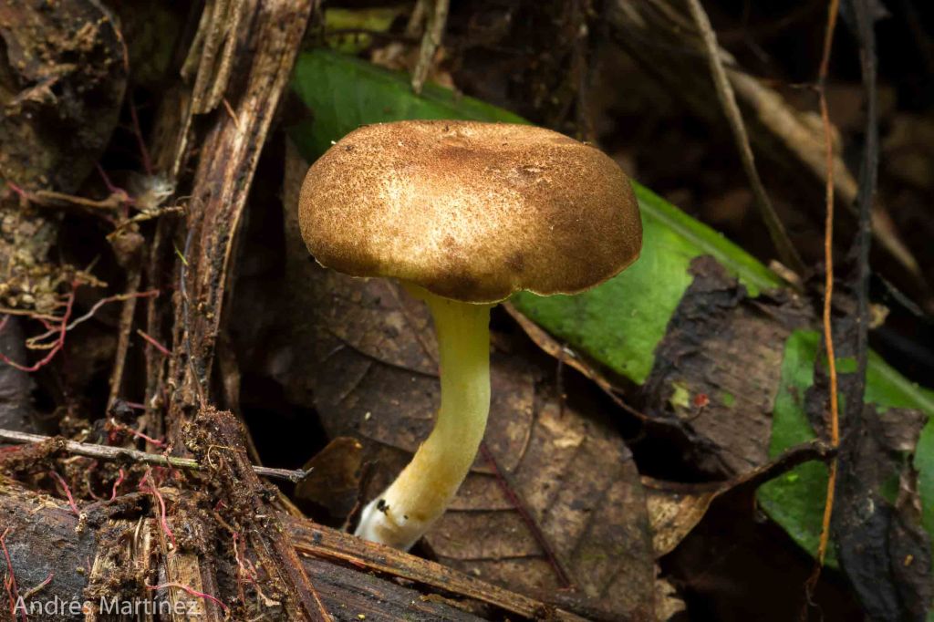 Descripción: Píleo convexo a depreso en la madurez; hasta 3.5 cm de diámetro; café claro con el centro café-rojizo; superficie finamente aterciopelada, seca y opaca; margen decurvado a proyectado; borde liso. Cutícula levemente desprendible. Reacción KOH amarillo a naranja vivo.
