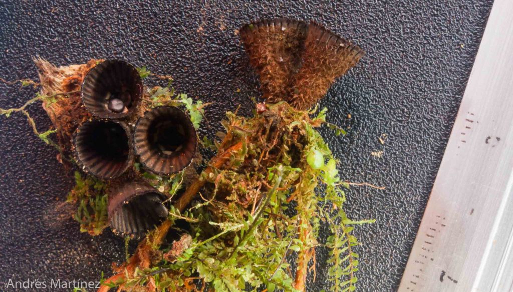 Descripción: Basidiocarpo en forma de copa cónica de hasta 1.5 cm de alto y 1 cm de diámetro; textura exterior estriada; marrón opaco y seco; cuando joven presenta una capa superior compuesta de mechones diminutos color marrón oscuro; el borde superior de la copa es crenado o serrado con diminutas setas o cilios abundantes de color negro, menores a 1 mm de longitud.