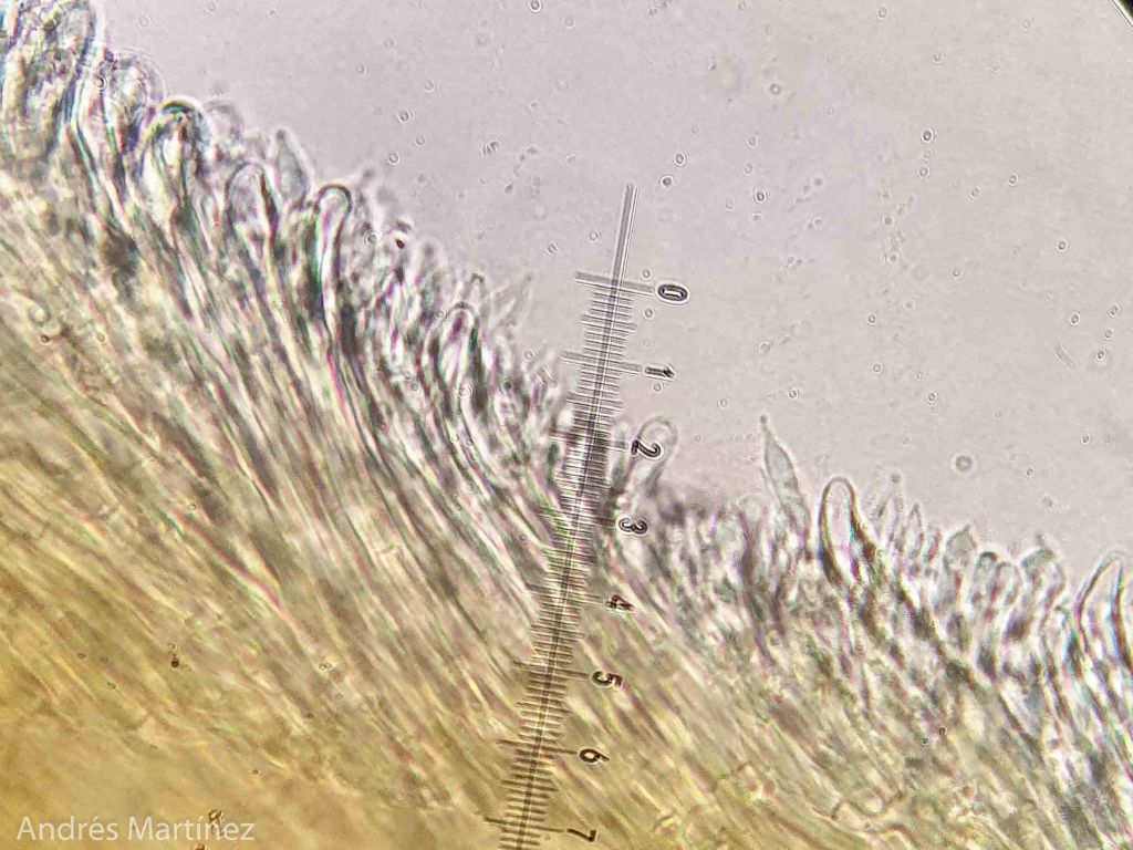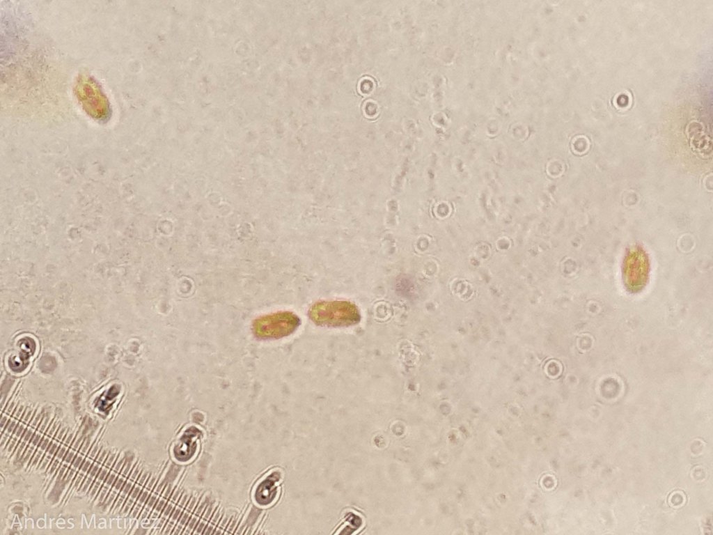 Basidiosporas elipsoidales a cilíndricas, 2.7 - 3.5 x 4.7 - 6 μm; hialinas en agua y KOH; pared gruesa y lisa; amiloides. No se observaron acantocistidios. se observaron basidiolos y cistidiolos con el ápice agudo y otros obtusos.