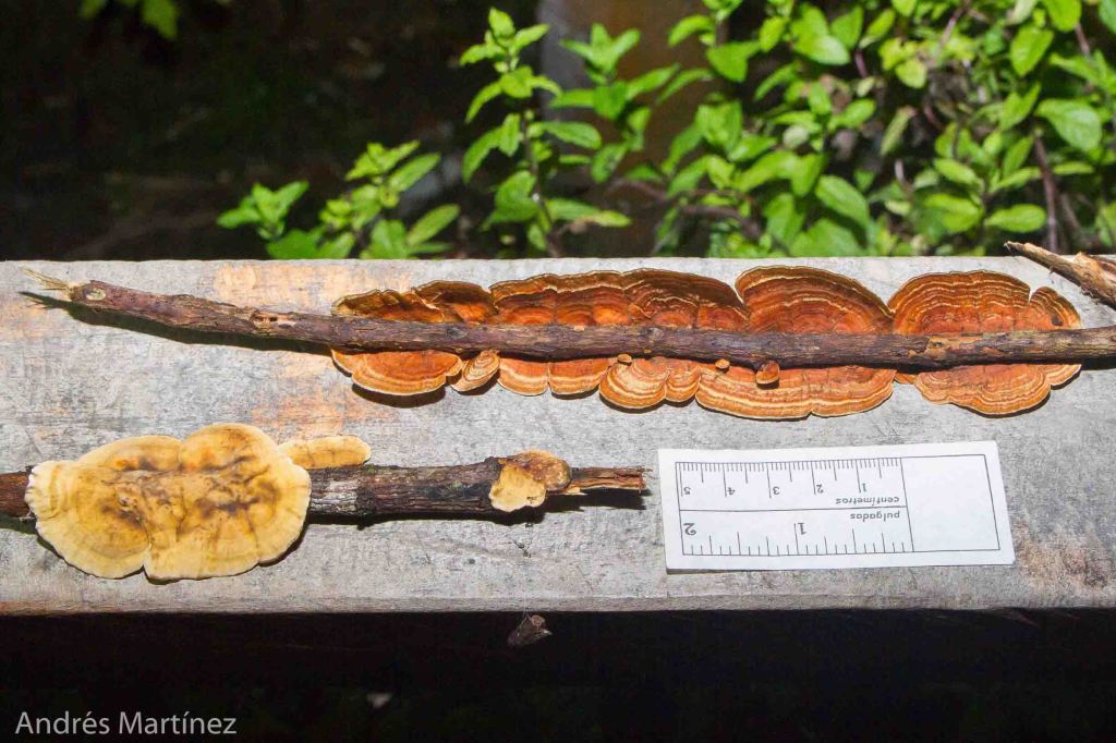 Descripción: Basidiocarpo sesil a efuso reflejo; consistencia coriacea; hasta 7x5x0.1 cm. Adherido al sustrato por el abhimenio, posiblemente varios esporomas unidos consecutivamente a la ramita; superficie del abhimenio con multiples zonaciones concentricas, de tonalidades, ocre, café y rojizas -naranja, seca, opaca, glabra a finamente velutinosa; borde liso y claro.