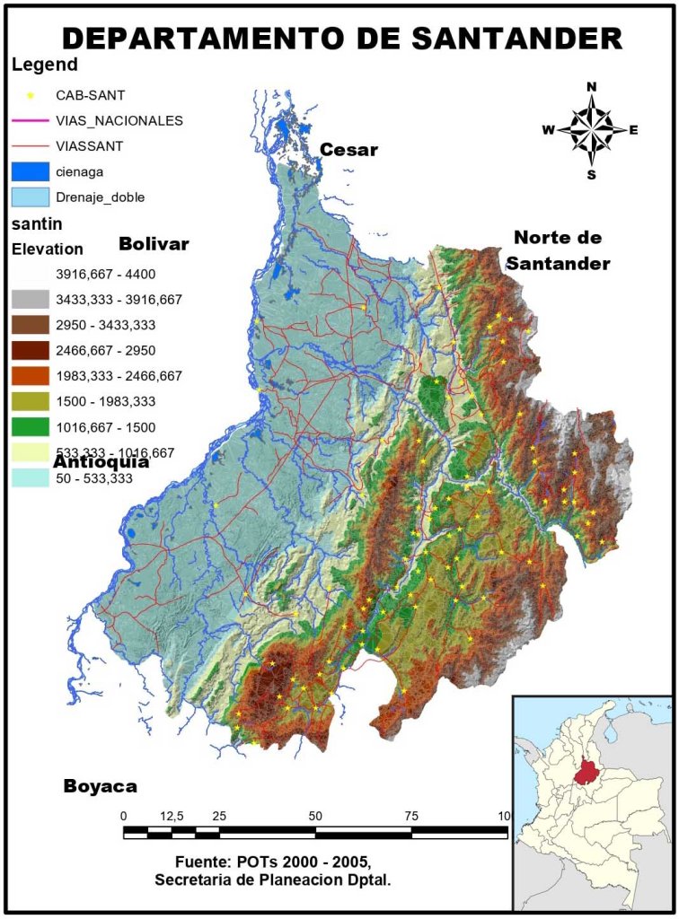 El departamento de Santander se ubica al nororiente de Colombia, sobre la cordillera Oriental y cuenta con un área de 30537 Km2 (www.dane.gov.co). Está compuesto por una amplia gama de unidades biogeográficas y ecosistemas naturales como las ciénagas, humedales y valles del Río Magdalena, pasando por ecosistemas xerofíticos y de bosque seco, hasta ecosistemas montanos como los bosques andinos y paramunos. Entre estos últimos se destaca el Parque Nacional Natural Serranía de los Yariguíes que corresponde al remanente boscoso andino mejor conservado y de mayor proporción en el departamento. Igualmente, Santander cuenta con una amplia variedad de ecosistemas intervenidos y transformados para actividades agrícolas y ganaderas.