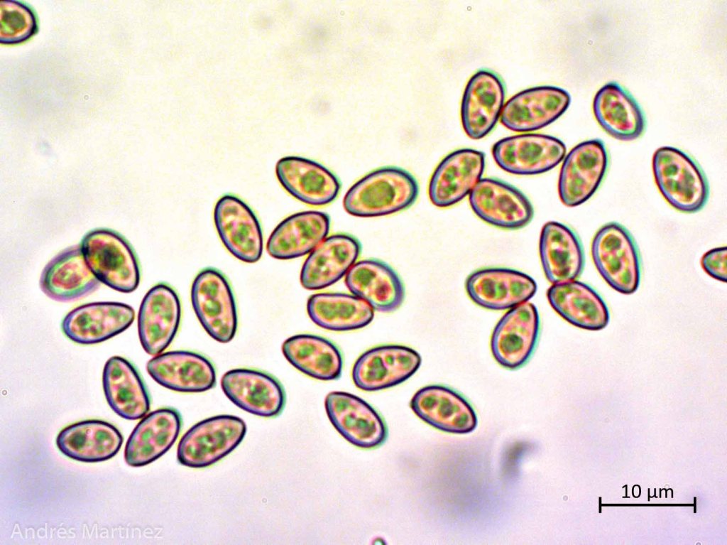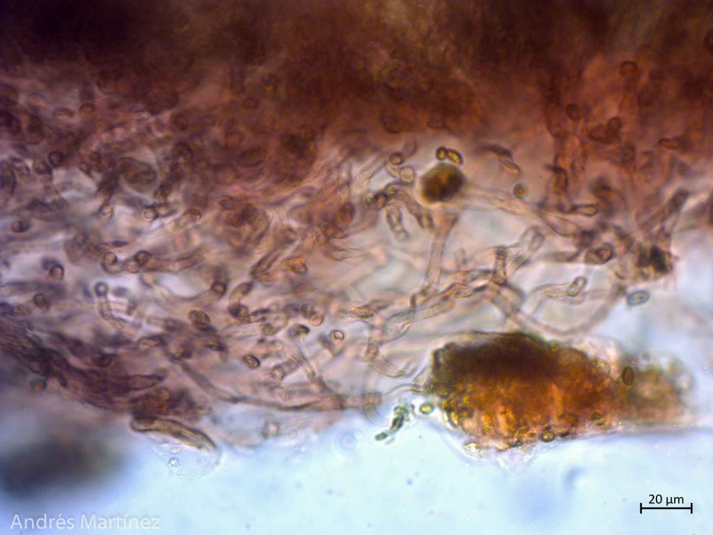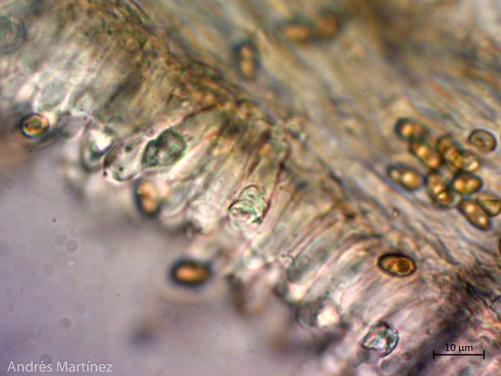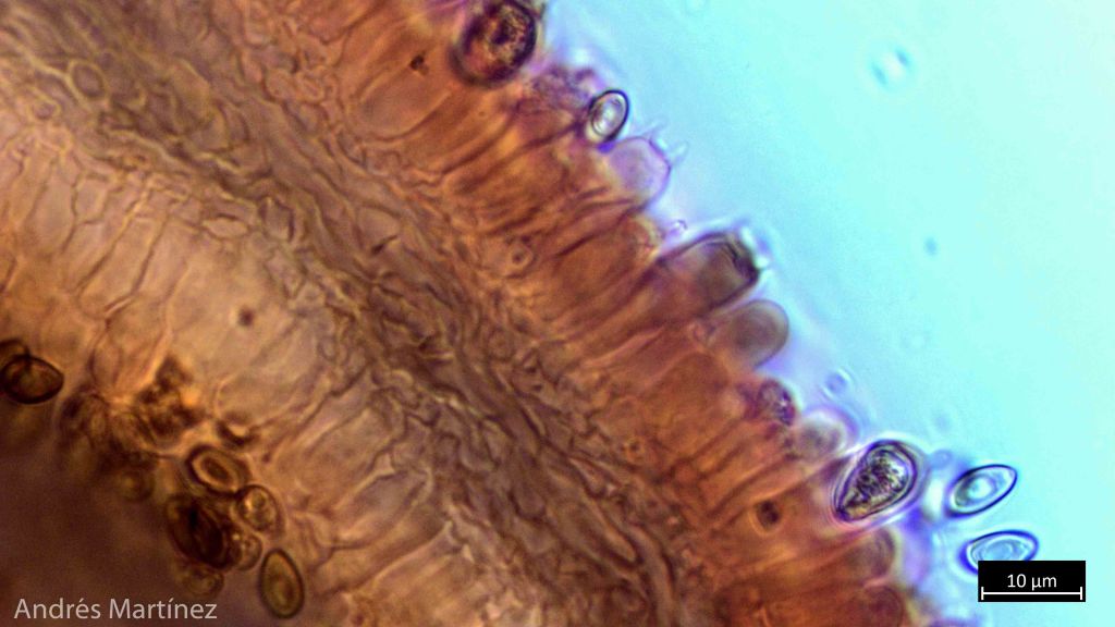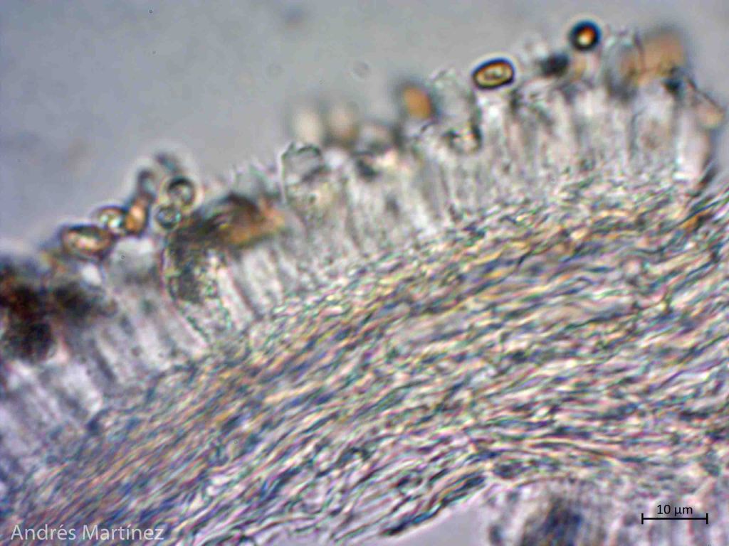 Basidiosporas oblongas a elipsoidales, 6.5 - 7.8 x 3.8 - 4.7 µm (Q=1.7), color café-amarillo pálido en agua y KOH, con pequeños contenidos aceitosos internos; pared lisa y delgada, apiculadas y con posible poro germinativo difícil de observar; inamiloides. Trama himenoforal regular; basidios tetraspóricos, claviformes, 16.8 - 24.4 x 5.6 - 8 µm, hialinos; criso-pleurocistidios lecitiformes, capitulados a mucronados, 15.8 - 22.3 x 5.6 - 8.4 µm, de pared delgada, hialinos, con incrustaciones amarillas oscuras en solución KOH; queilocistidios no observados (sin embargo bajo el estereoscopio se observa el borde de la lamela blanquecino). Pileipellis tipo ixocutis, con hifas hialinas, pigmentadas de morado en KOH, 2.6 - 4.3 µm de ancho, septadas y posiblemente con presencia de fíbulas.
