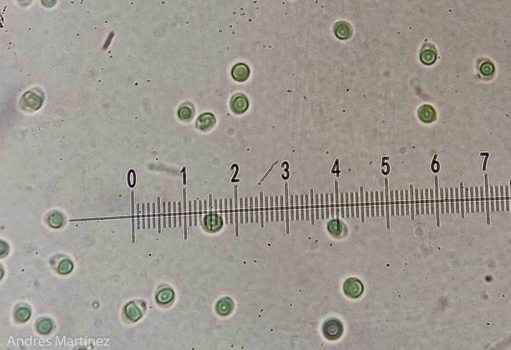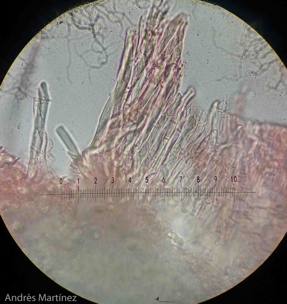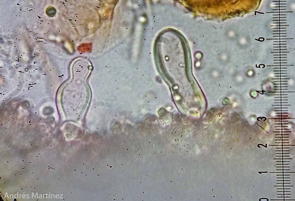 Basidiosporas ampliamente elipsoidales a subglobosas, (4) 4.3 - 5.35 (5.4) × (3.6) 3.7 - 4.8 (5) µm, Q = 1 - 1.35 (1.4) ; N = 25, Me = 4.8 × 4.2 µm ; Qe = 1.2; hialinas, de pared simple y lisa, inamiloides; himenocistidios variables y dispersos, algunos metuloides y capitados, otros de pared simple, flexuosos, lecytiformes y utriformes, 33 - 62 × 10.8 -14.5 µm, todos hialinos y de pared lisa. Sistema hifal dimitico, con hifas generativas hialinas, septadas y fibuladas, hifas esqueléticas hialinas y de pared gruesa; tejido inamiloide. Pileipellis tipo tricodermo.