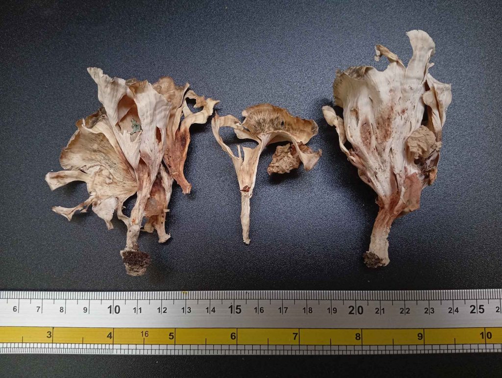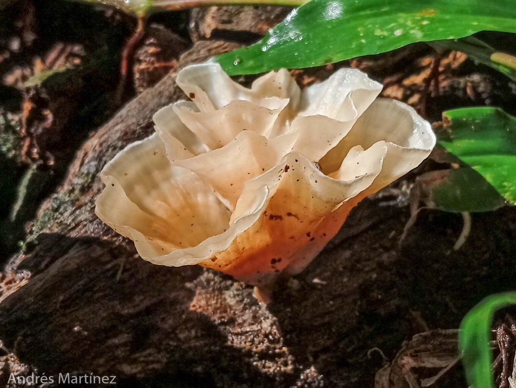 Descripción: Basidiocarpo espatulado a flabelado, en ocasiones formando grandes rosetas; consistencia cartilaginosa en fresco, coriácea en seco; tamaño variable, hasta 6 cm de ancho, 8 cm de longitud y 2 mm de grosor; cuando forma rosetas compuestas miden hasta 20 cm de diámetro; color blanco crema a beige oscureciendo a café rojizo o naranja oscuro, sobretodo hacia la base; presenta zonaciones concéntricas débiles; borde superior liso y débilmente lobulado.