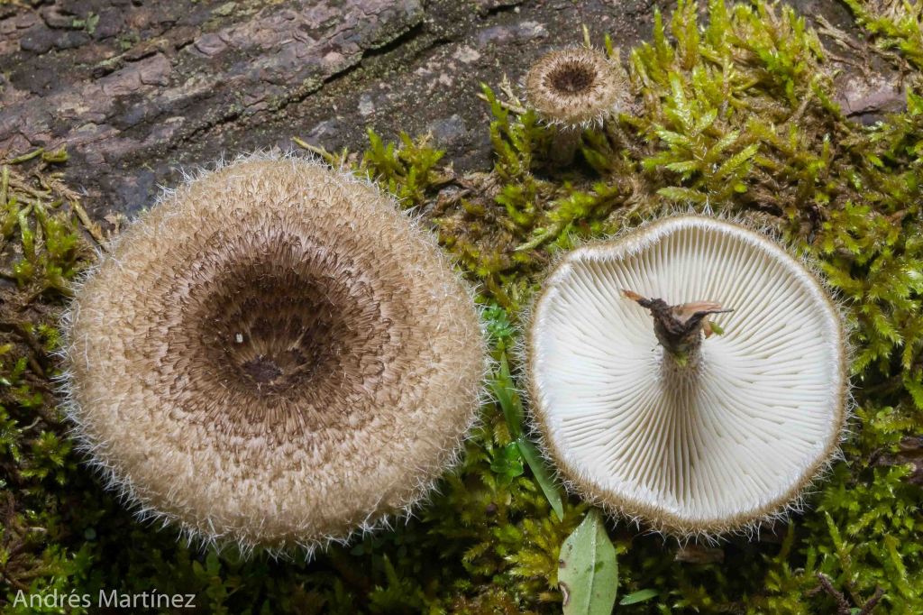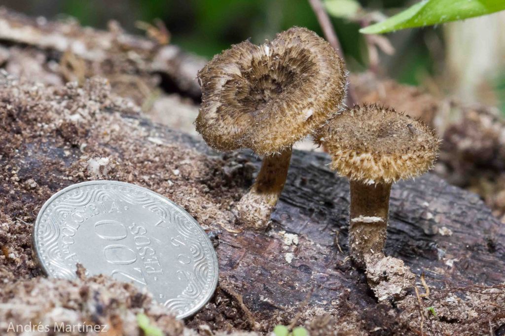 Descripción: Basidiocarpo de consistencia correosa. Píleo plano convexo a infundibuliforme; hasta 4 cm de diámetro; muy similares de juveniles y adultos; superficie seca, opaca a brillante, con escuamulas fibrilosas a manera de mechones de 2 mm de longitud, más gruesos al centro y flocosos al borde, color marrón oscuro hacia el centro, marrón pálido a beige hacia el borde; margen enrollado hacia el himenóforo. Contexto hasta 2 mm de espesor, color blanco crema. Himenóforo laminar, adnado a decurrente; laminas de 3 mm de ancho con el borde crenado, color blanco crema; presenta estructuras puntiagudas diminutas en los lados de las lamelas a manera de cistidios grandes. Estípite central a excéntrico, cilíndrico, hasta 2.5 cm de longitud, y 6 mm de grosor; Color, textura y ornamentación similar al píleo.