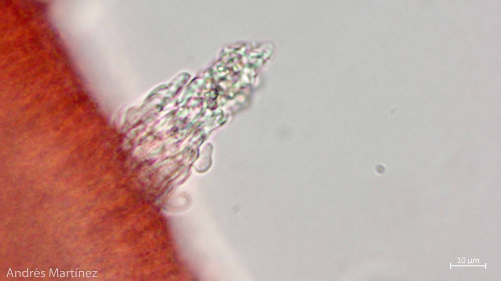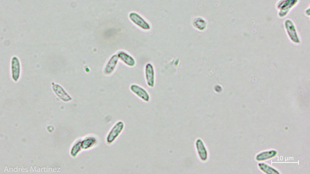 Esporada blanco crema; basidiosporas cilíndricas, (Q= 2.5). 5.6 - 7.3 x 2.1 - 3 µm, hialinas en KOH; de pared simple y lisa, inamiloides; no se observa poro germinativo. Trama himenoforal entrelazada. Hifas de la cutícula dispuestas a manera de cutis, con tonalidades amarillo-marrón. Estructuras laterales de las lamelas a modo de cistidios gigantes 37.9 - 46.4 µm X 19.3 - 24.9 µm (fácilmente vistos bajo la lupa), hialinos.