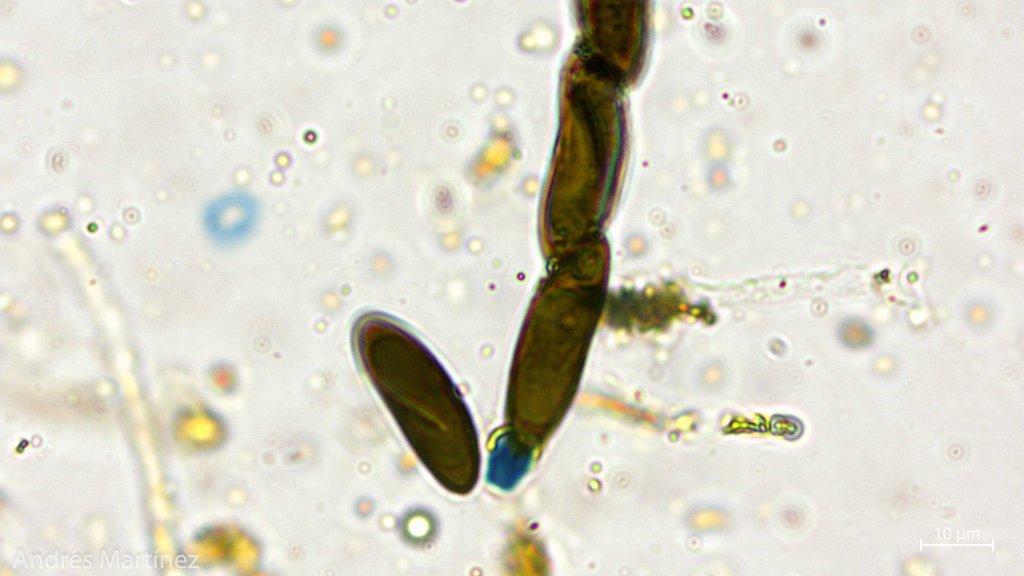 Ascosporas alantoides a fusiformes, 19.6 - 28 x 6 - 8.8 µm (Q= 2.9), lisas, hialinas en estadío juvenil, café a café verdoso muy oscuro a negro en la madurez, inamiloides, gutuladas. Ascas clavadas y cilíndricas, 8 ascosporas dispuestas en una fila, unitunicadas, de aproximadamente 164-193 x 10-11 µm; ápice amiloide.