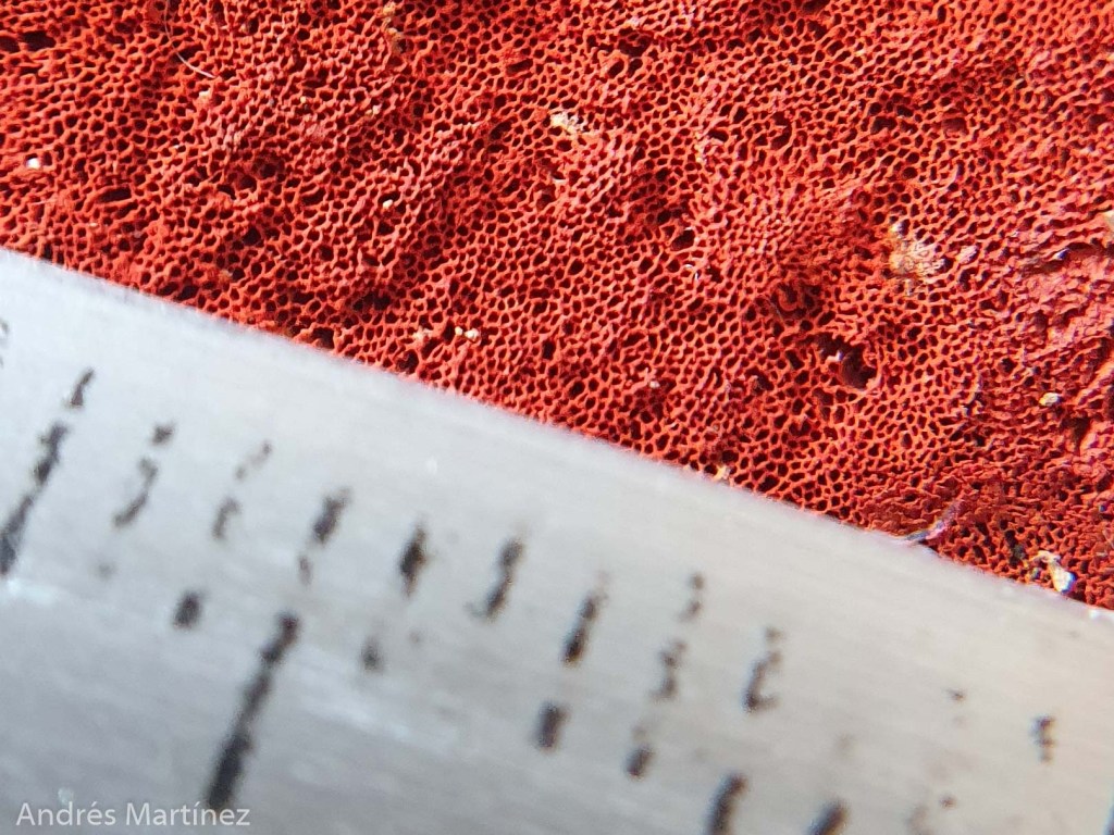 Descripción: basidiocarpo anual, sésil y dimidiado; hasta 9x4.6x0.7 cm; consistencia coriácea a leñosa; superficie superior color naranja vivo, glabra, lisa, seca, opaca (en ocasiones brillante), con zonaciones concéntricas; borde liso a ondulado y agudo. Contexto leñoso, hasta 4 mm de grosor, concoloro con la superficie del píleo o más claro. Himenóforo poroide, concoloro, poros diminutos y angulares, de 7 a 8 poros / mm; tubos no estratificados, de hasta 3 mm de longitud. Reacción KOH+ inmediata en todo el basidiocarpo virando a amarillo-verdoso pálido.