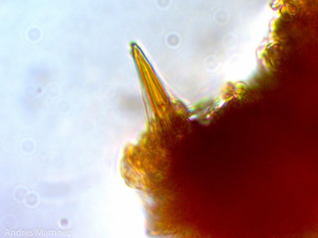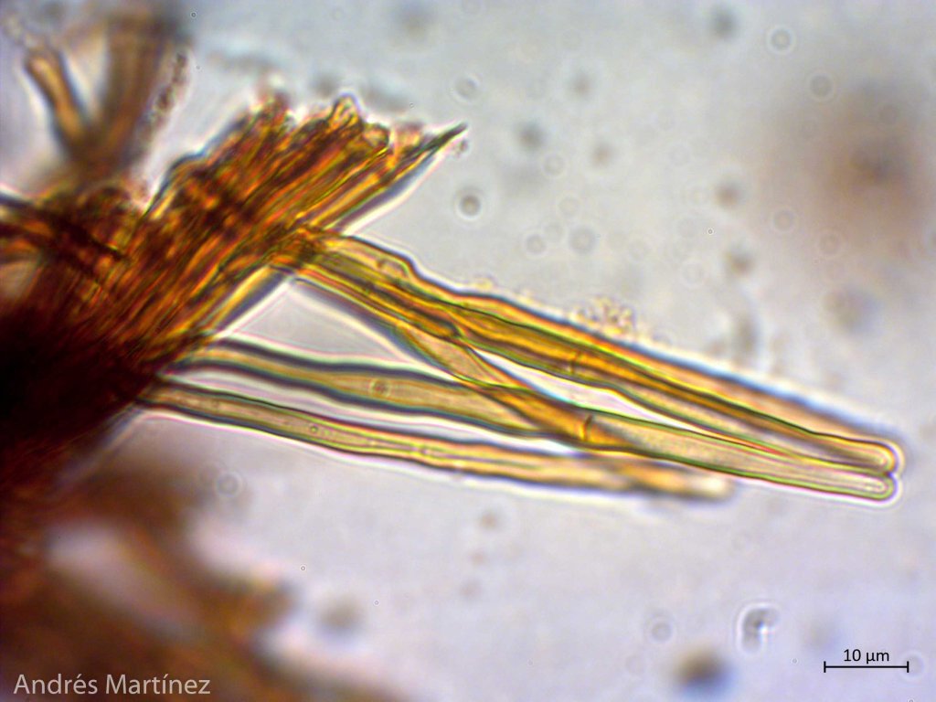 Esporas no observadas; sistema hifal dimítico, con hifas generativas septadas, sin fíbulas, pigmentadas y de pared gruesa; hifas esqueléticas de pared gruesa, pigmentadas; setas himeniales de pared gruesa, 21-30 x 4 - 7 µm, agudas, color café ámbar oscuro.