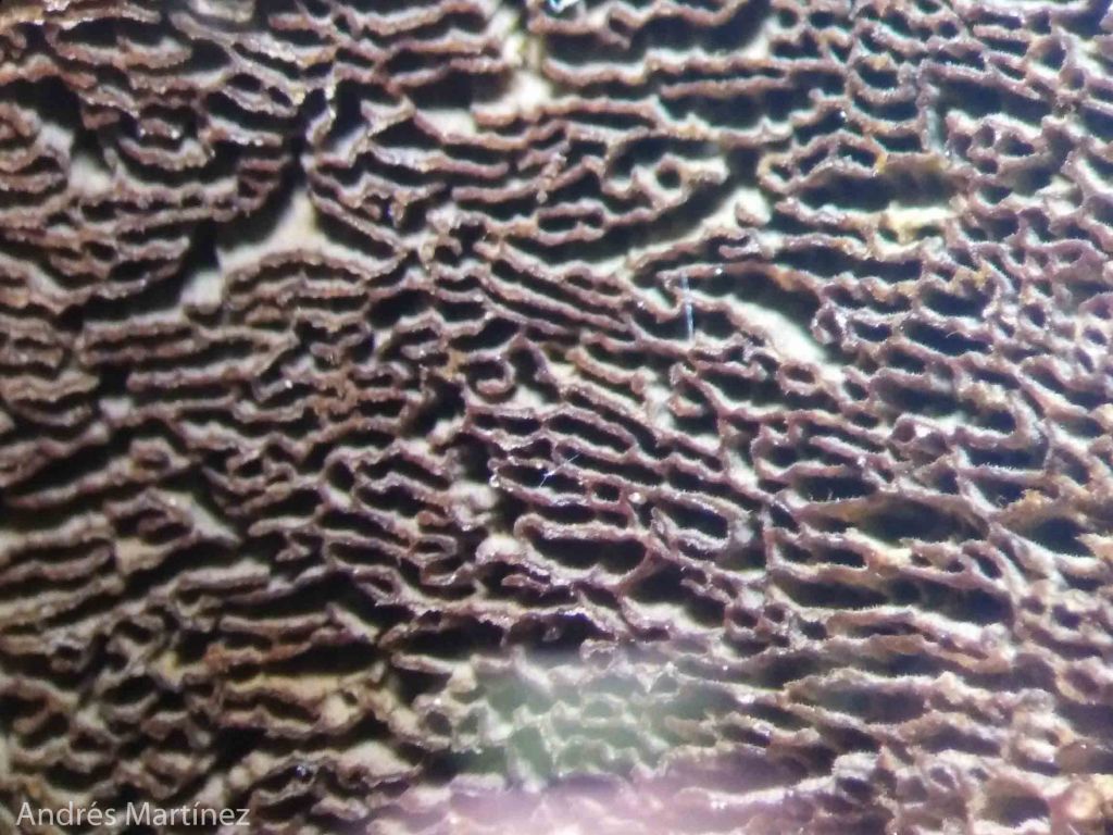 Poros sinuosos hacia el margen del basidioma