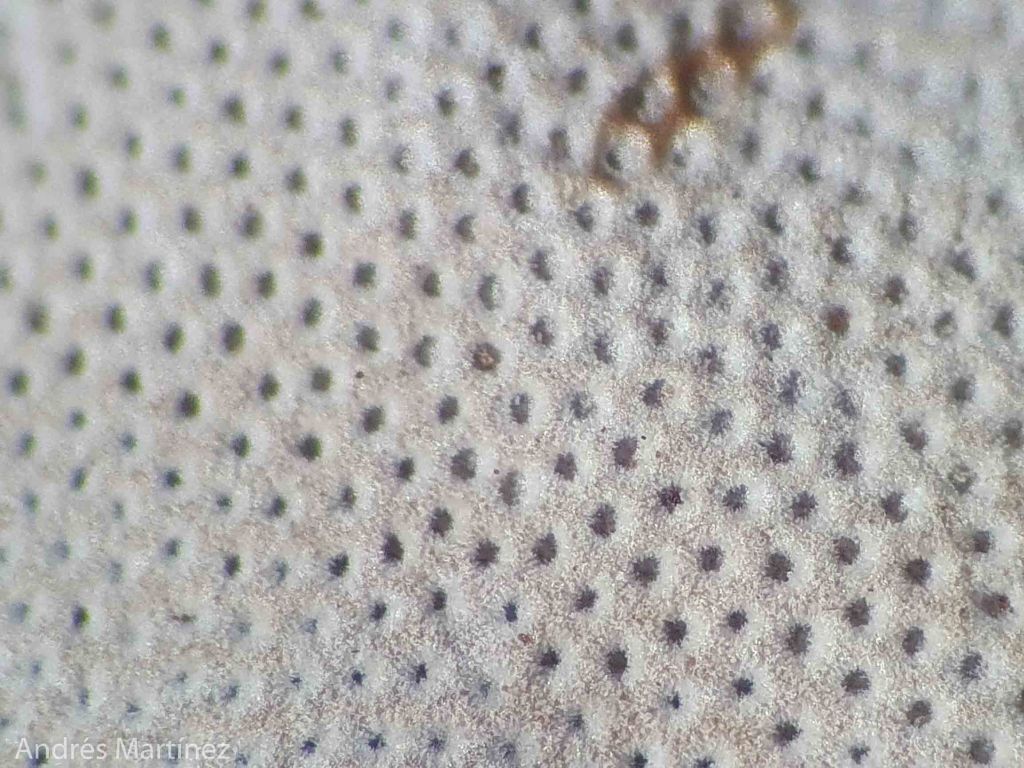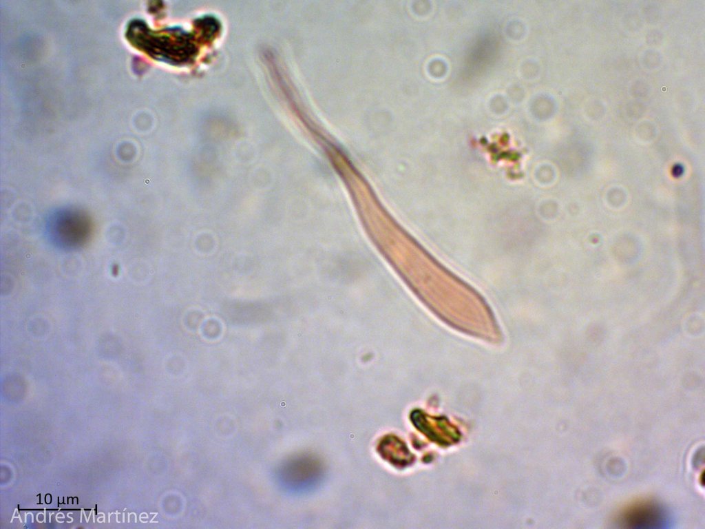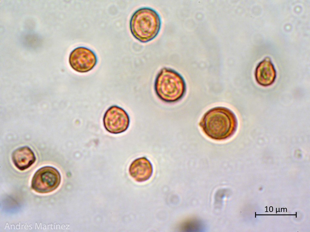Basidiosporas globosas a subglobosas, 6.3 - 9.2 x 5.6 - 8.3 µm (Q=1.1), hialinas, moderadamente apiculadas y de pared gruesa y aparentemente lisa, aunque se alcanzan a ver unas verrugas gruesas pero difusas; hIfas de la cutícula pigmentadas.