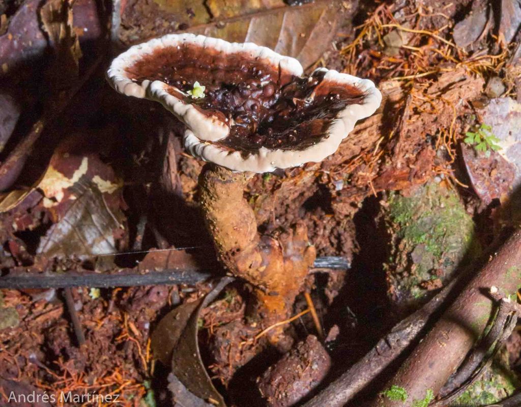 Descripción: Basidiocarpo anual, pileado estipitado; hasta 7.5 cm de diámetro, 6 mm de grosor, semicircular a lobulado, levemente depreso hacia el centro; consistencia leñosa; superficie seca, opaca a levemente brillante hacia el centro con capa lacada; zonado concentricamente con colores marrón rojizo oscuro en el centro degradándose a rojo vinotinto, borde redondeado blanquecino. La cutícula superior no mide más de 1 mm de grosor. Contexto (revisado solo en seco) hasta 7 mm de grosor, aspecto leñoso, color marrón claro acartonado, homogéneo, no se observa ninguna línea ni franja divisoria entre los tubos y la cutícula. Himenóforo poroso, poros circulares e irregulares muy diminutos, de 7 a 8 poros/mm (contados en seco), color blanco grisáceo; tubos de hasta 2 mm de longitud. Estípite hasta 15 cm de longitud, 1.5 cm de grosor, leñoso, color madera, contextura y forma irregular, central a excéntrico. Olor fúngico fuerte