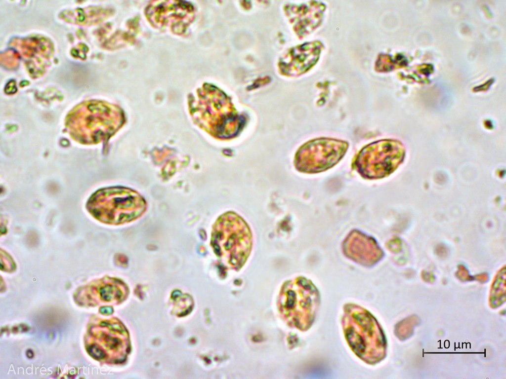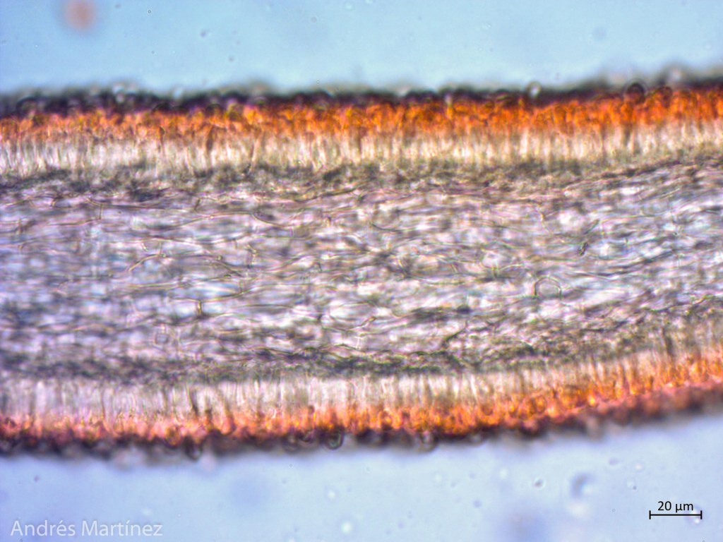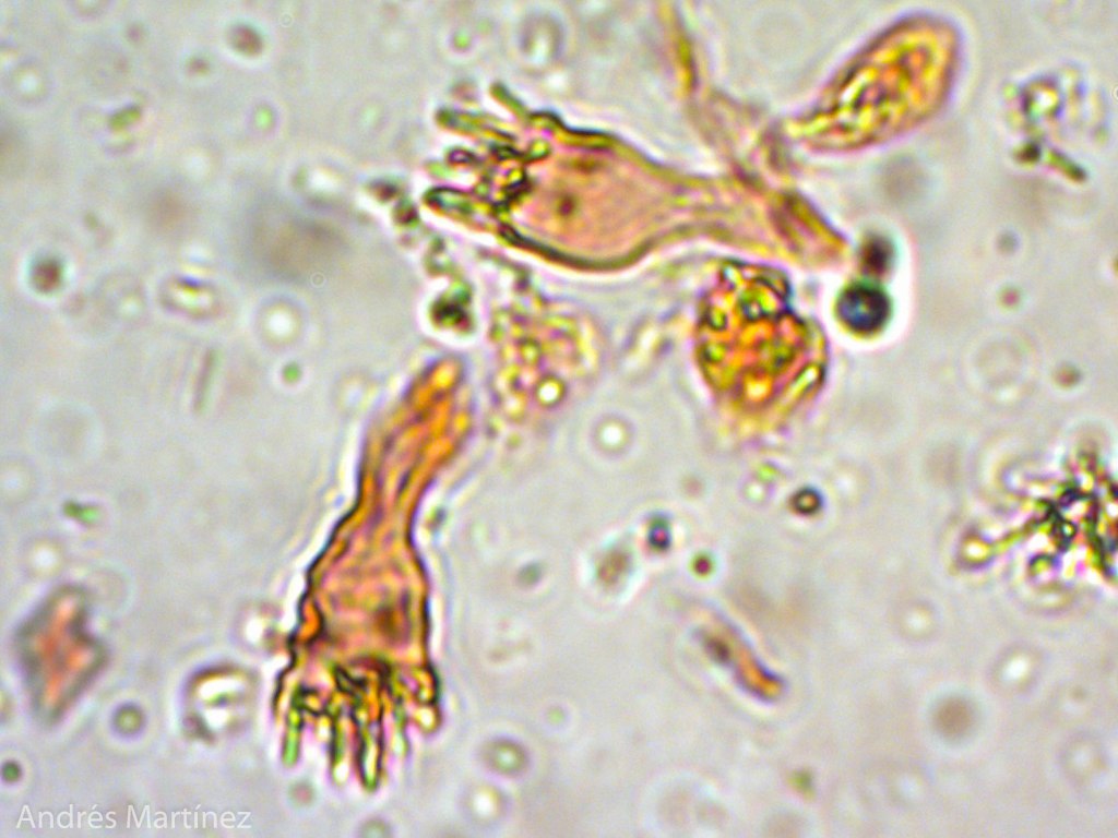 Basidiosporas ampliamente elipsoidales a citriformes, 8.3 - 10.6 x (4.3) 5.3 - 7.5 µm (Q=1.5 ), hialinias en agua y KOH, apiculadas, con incrustaciones oscuras. Trama himenoforal subregular; algunas aristas lamelares con extensiones o pelos muy largos, hialinos y algo ramificados; cistidios en forma de brocha con varios apéndices terminales (broom cells tipo siccus) , 17 - 32 x 7 - 11 µm, con entre 5 y 8 apendices.