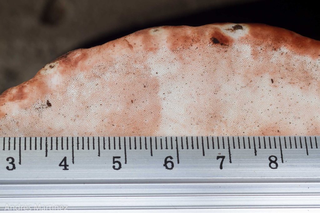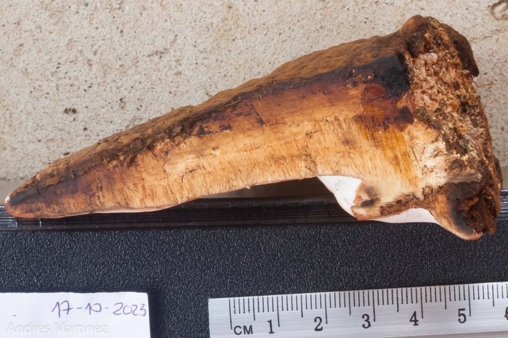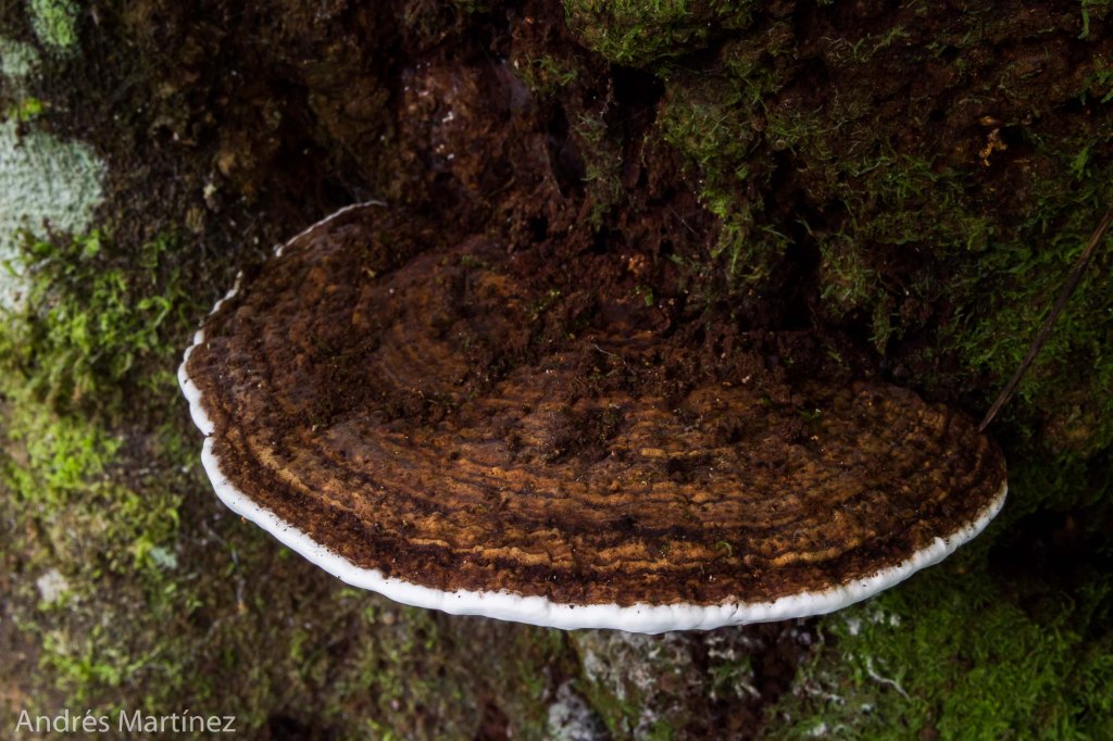 Descripción: Basidiocarpo anual, sésil, dimidiado; consistencia leñosa; hasta 15x10x2.5 cm; superficie superior café-chocolate con tintes rojizo oscuro, seca, glabra, opaca, irregular, zonada concentricamente; borde redondeado, blanco, en ocasiones con tonalidades rojizas, 2 mm de ancho, glabro. Superficie inferior porosa, blanca; poros circulares regulares, de 4 a 6 poros/mm; reacción café rosa al contacto; reacción KOH+ verde oliva oscuro en después de un minuto. NH4OH+ verde oliva claro después de un minuto. Contexto leñoso, café claro a oscuro, hasta 1.2 cm de grosor (solo contexto); tubos café claro, a veces más oscuro hacia la superficie superior; hasta 9 mm de longitud; entre el contexto y la superficie superior hay una capa casi negra que empieza gruesa desde la base hasta casi desaparecer hacia el borde; reacción KOH-. Adherencia al sustrato en forma circular irregular, Olor fungico, sabor no registrado. Esporada: no obtenida