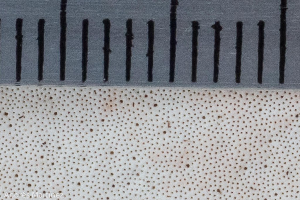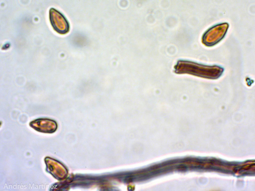 Basidiosporas lacrimoides a amigdaliformes, 7 - 9.6 (10) x 4 - 5.1 μm (Q=1.8), hialinas, de pared doble y lisas, ápice levemente truncado, dextrinoides. Sistema hifal trimítico: hifas esqueléticas congófilas, de pared gruesa y dextrinoides: hifas de abrazadera de pared gruesa.