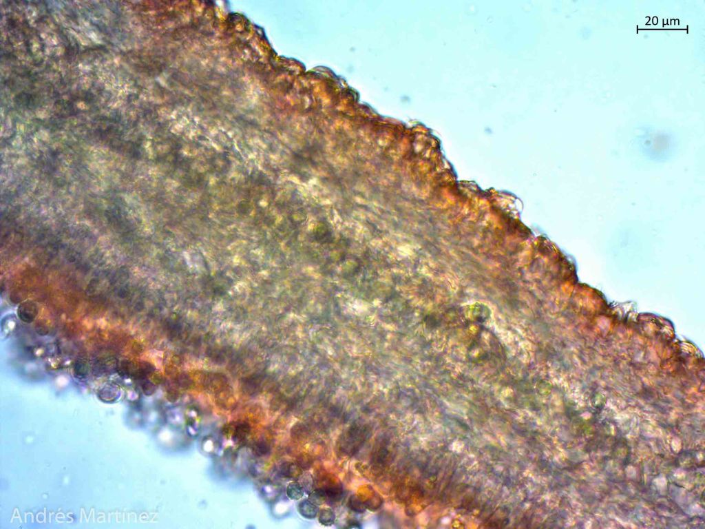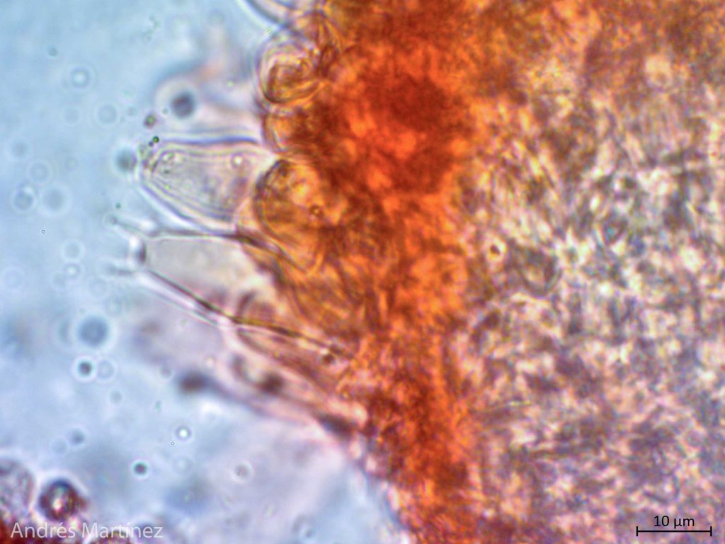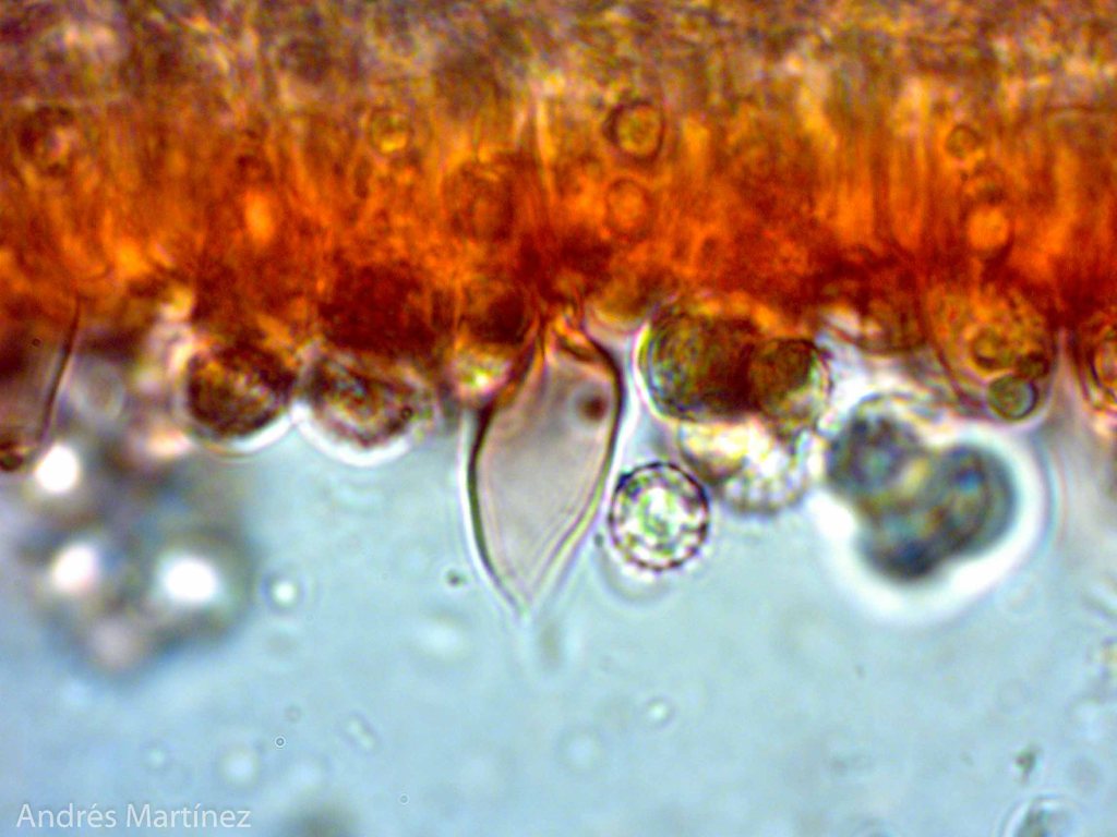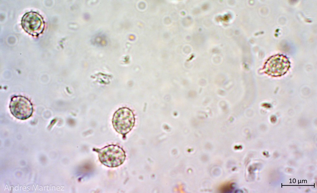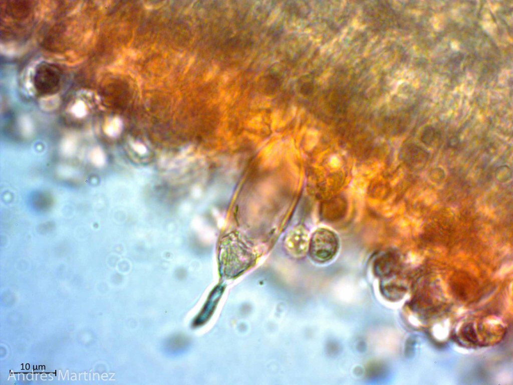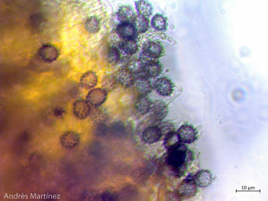 Basidiosporas globosas a subglobosas, 6.8 - 8.3 x 6.3 - 7.5 µm (Q=1.1), hialinas en agua y KOH, fuertemente verrucosas (con forma de púas), apiculadas; pared gruesa; amiloides. Trama himenoforal irregular; basidios bisporicos y tetraspóricos, ventricosos, 36 - 11 µm, hialinos y de pared simple; sulfo - pleurocistidios lanceolados, acuminados, rostrados y digitados con cabeza alargada y delgada, 20 - 50 x 9 - 15 µm, algunos hialinos, otros con incrustaciones amarillo oscuro, sobretodo en el ápice; queilocistidios rostrados, a ovoidales con ápice agudo, 17 - 10 µm, hialinos.