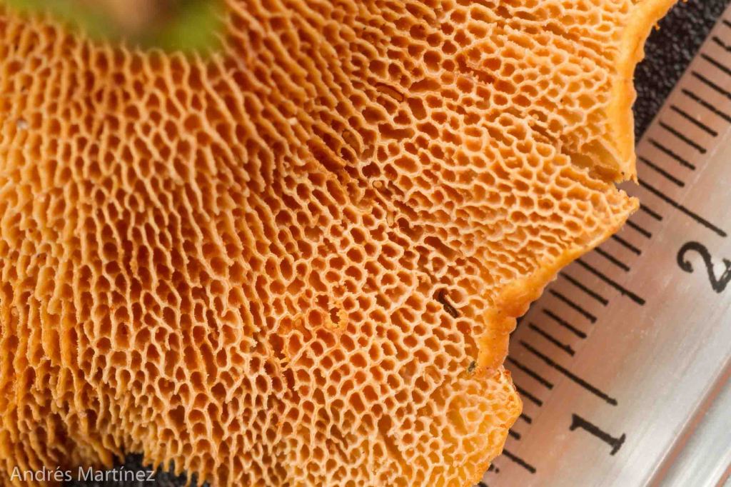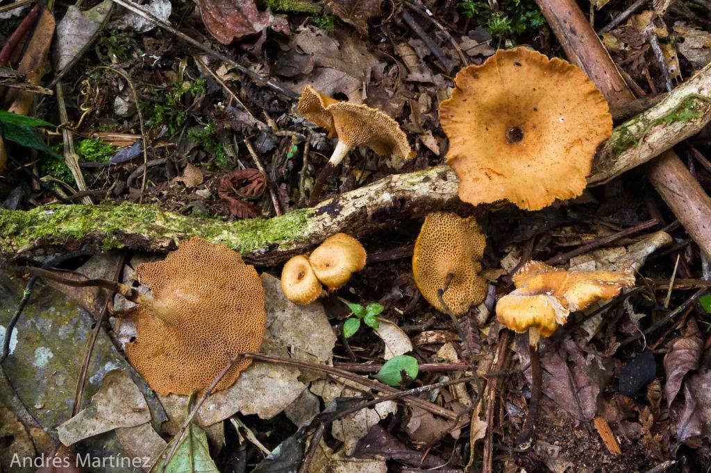 Descripción: Basidiocarpo pileado-estipitado; convexo, plano-convexo y depreso de juvenil a infundibuliforme en la madurez; hasta 7 cm de diámetro y 4 cm de altura; color variable con matices marrón-naranja claro y oscuro; glabro o algo granuloso; borde incurvado, crenado a fimbriado, a veces ondulado. Contexto delgado; beige claro; inmutable; longitud de los poros de hasta 2 mm. Himenóforo poroso; concoloro o más palido; poros poligonales, algo alargados de hasta 2 mm; 1 - 2 poros/mm; unión decurrente. Estípite central; con presencia de rizomorfo de apariencia leñosa; hasta 13 cm de longitud y 0.4 cm de grosor; claro hacia el ápice, oscuro hasta la base; hueco solo en la zona apical. Olor indistinguible; sabor fúngico suave. Reacción KOH café en todo el basidioma.