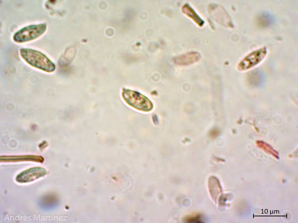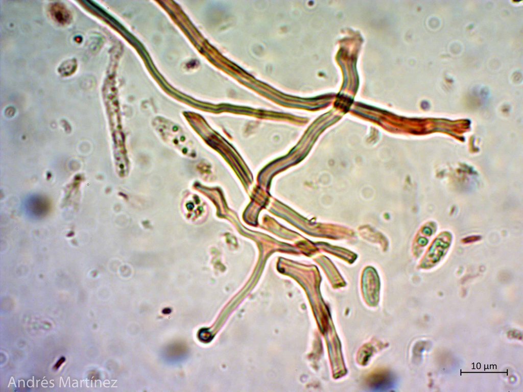 Basidiosporas cilíndricas a subfusiformes, (7.5) 8.8 - 11.7 x 3.3 - 5.1 µm (Q=2.3), hialinas en agua y KOH, pared simple y lisa, apiculadas y con múltiples incrustaciones, inamiloides; cistidios escasos y dispersos, 67 - 120 x 54 - 32, hialinos, rugosos; hifas esqueléticas muy largas y de paredes gruesas, hialinas y sin septos.