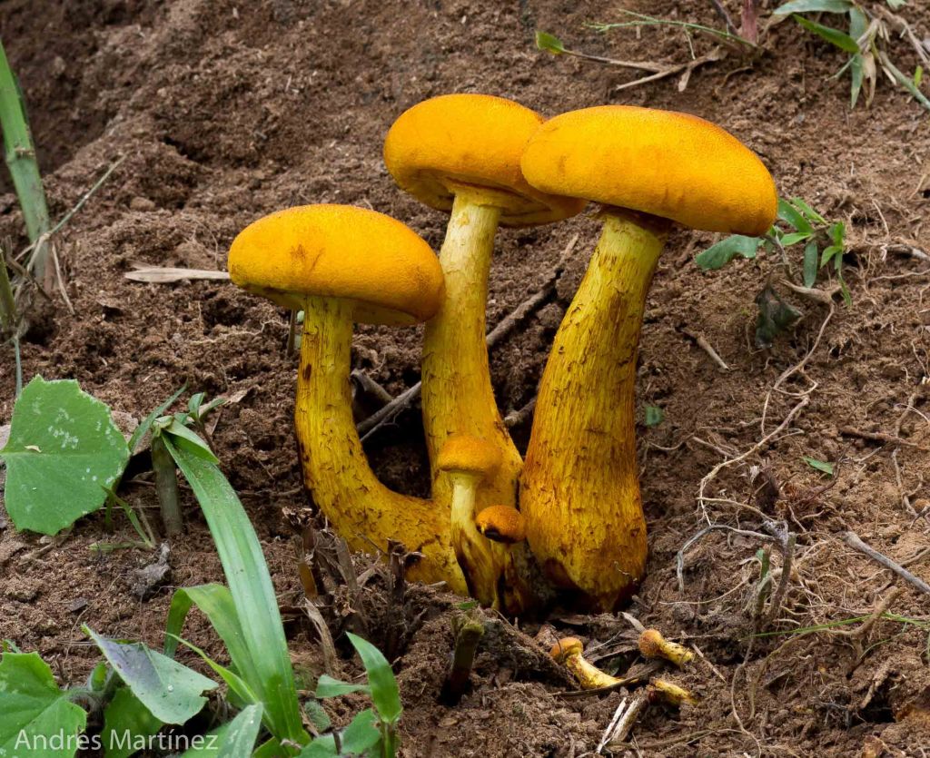 Descripción: Píleo convexo a plano-convexo; hasta 8 cm de diámetro; amarillo-naranja intenso, marrón hacia el centro; superficie seca, opaca, finamente granular; presenta pequeños agregados de pelos muy finos color marrón al mirarlo con lupa; borde incurvado, liso.